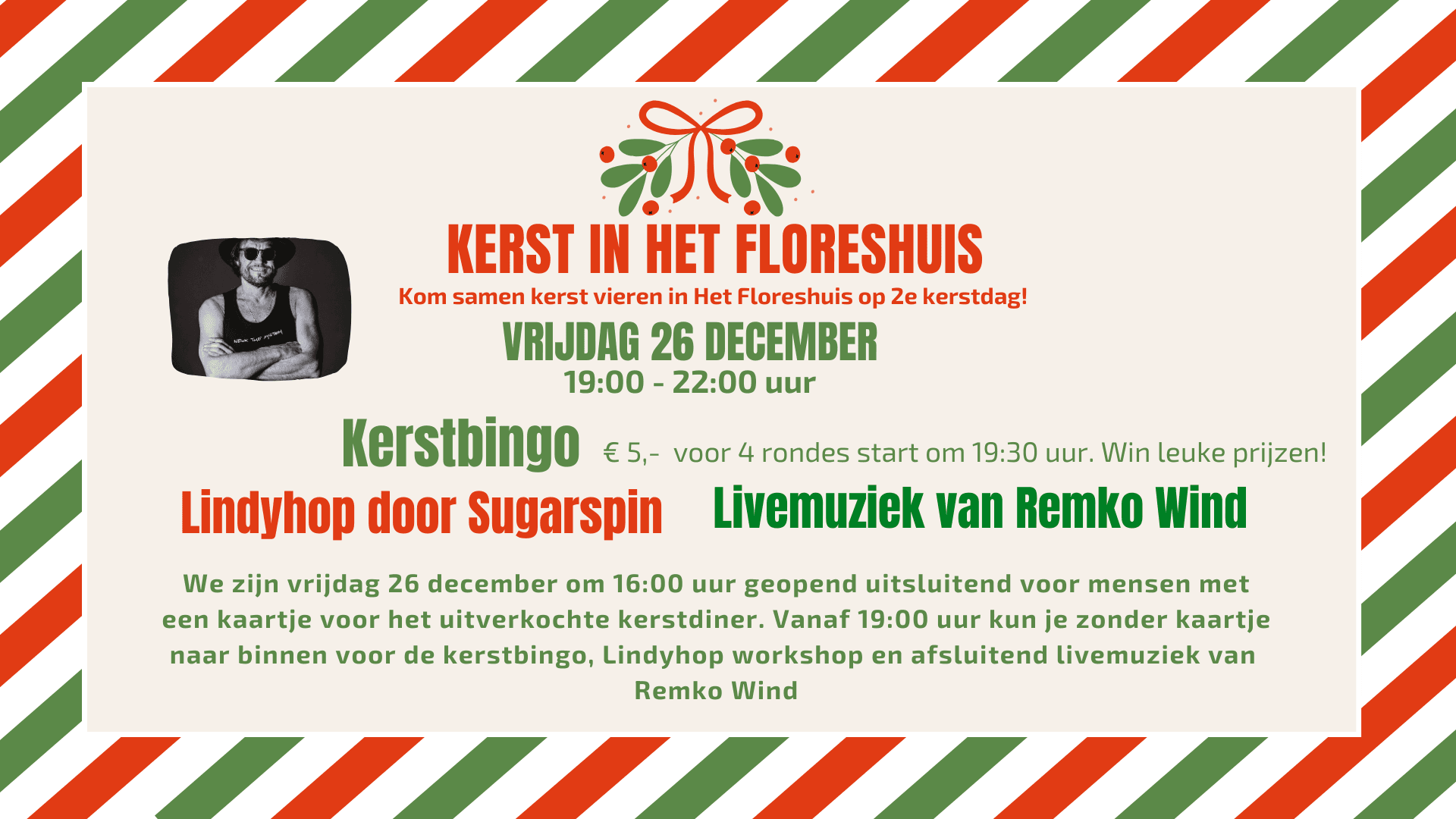 Tweede kerstdag hebben we zoals ieder jaar een gezellige kerstavond in Het Floreshuis. We beginnen met het diner (is uitverkocht). Mensen met een kaartje kunnen vanaf 16:00 uur naar binnen...