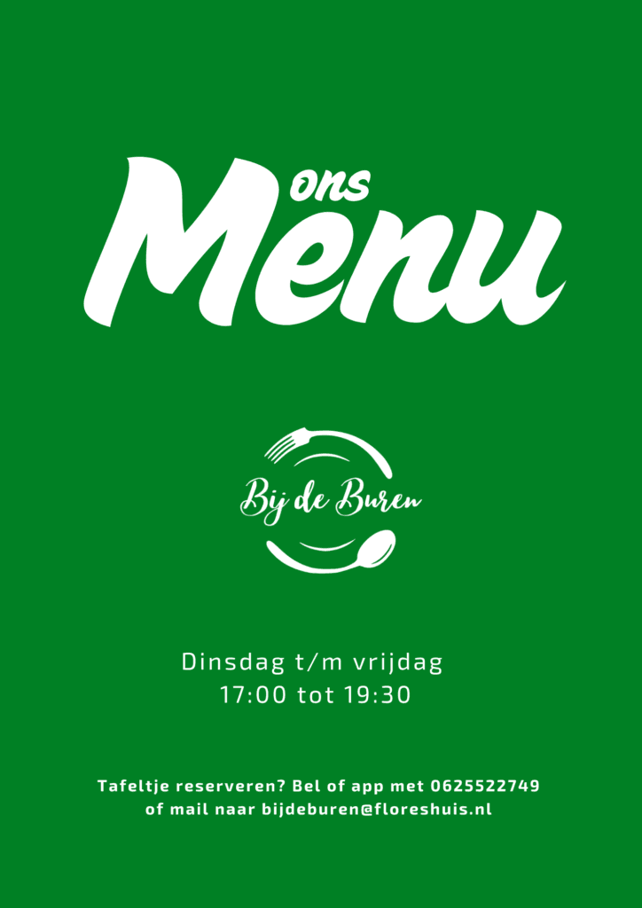 Moi! Welkom in ons wijkrestaurant Bij de Buren. Je kan bij ons terecht voor een gezonde, goede maaltijd tegen een zo laag mogelijke prijs. Zie hieronder de menukaart van deze week.