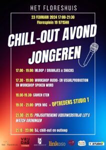 Vrijdagavond 23 februari is een avond speciaal voor jongen uit de wijk! Kom lekker chillen, eten, volg workshops, doe dansjes en kijk naar optredens!