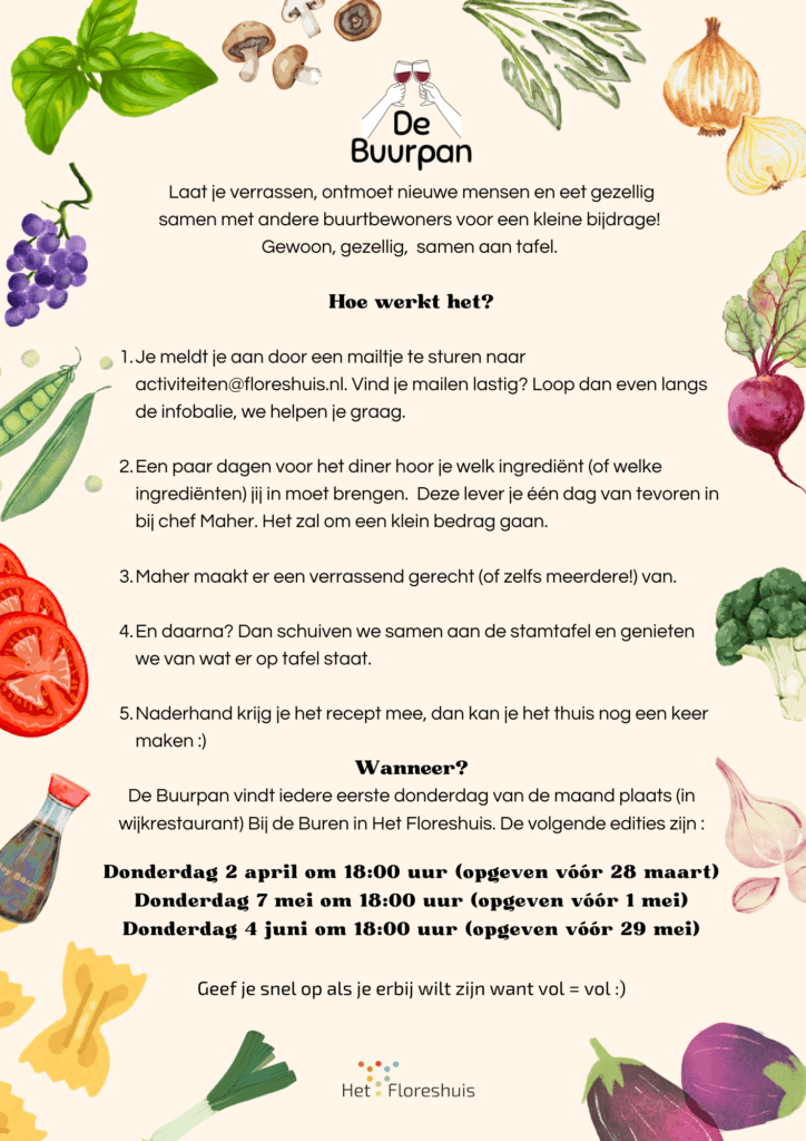 Mocht dit niet lukken dan kan je je ook alvast aanmelden voor de Buurpan op 7 mei (aanmelden vóór 1 mei) óf de Buurpan van 4 juni (opgeven vóór 29 mei).